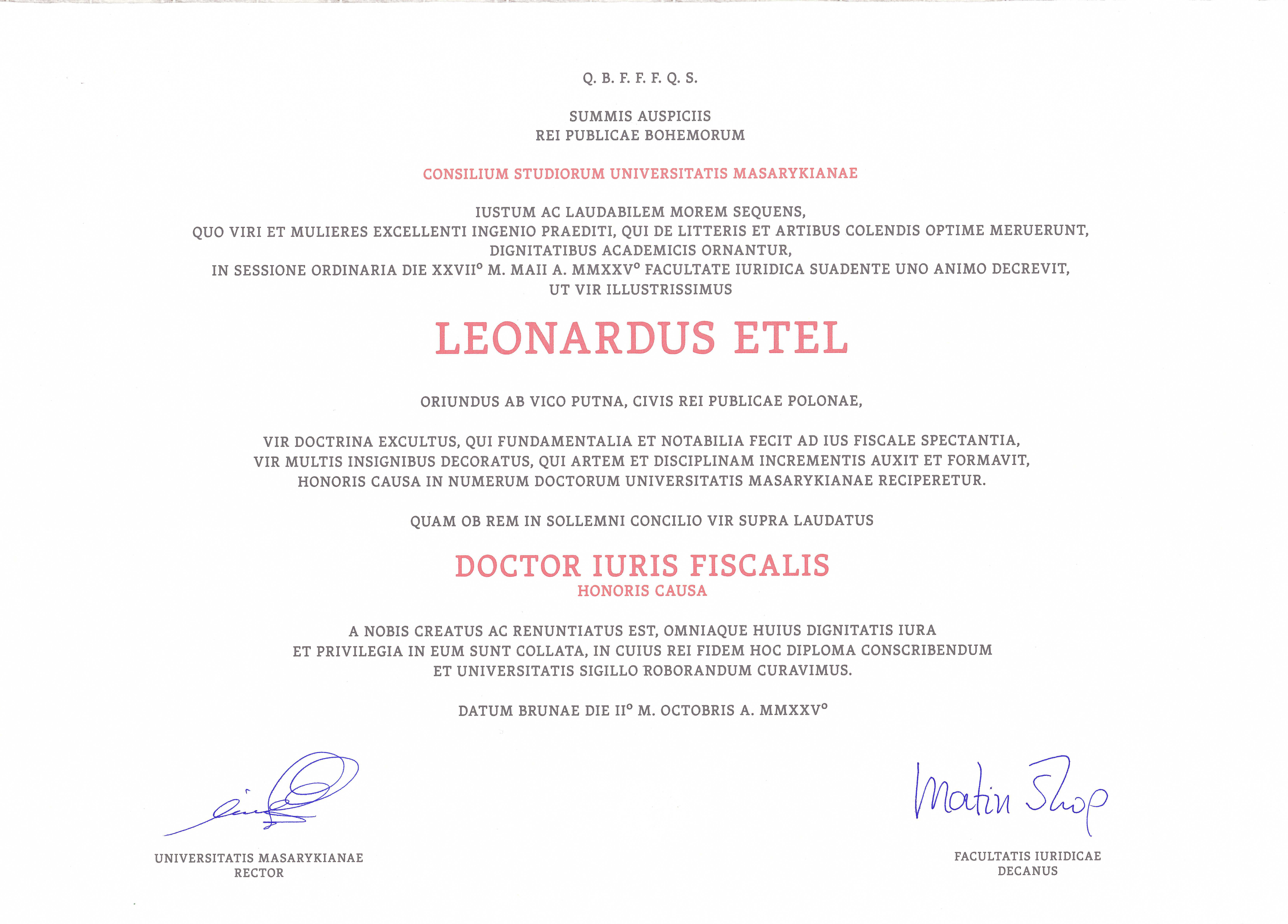 Z radością informujemy, że Prezes naszego Centrum - prof. dr hab. Leonard Etel - otrzymał 2 października 2025 tytuł doktora honoris causa Uniwersytetu Masaryka w Brnie!